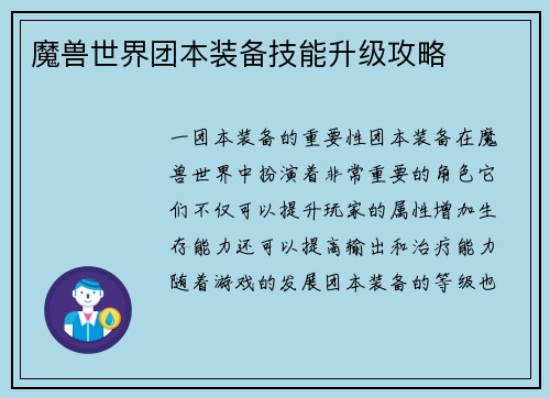魔兽世界团本装备技能升级攻略