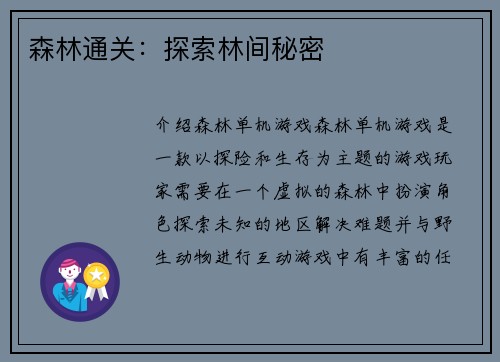 通关森林单机游戏需要玩家具备一定的智慧、技巧和耐心。选择合适的角色、探索地图和收集资源、与野生动物互动、解决难题和完成任务、提升角色能力、制定合理的战略以及保持耐心和毅力,这些都是通关的关键。希望能够帮助玩家更好地通关森林单机游戏,享受游戏带来的乐趣。